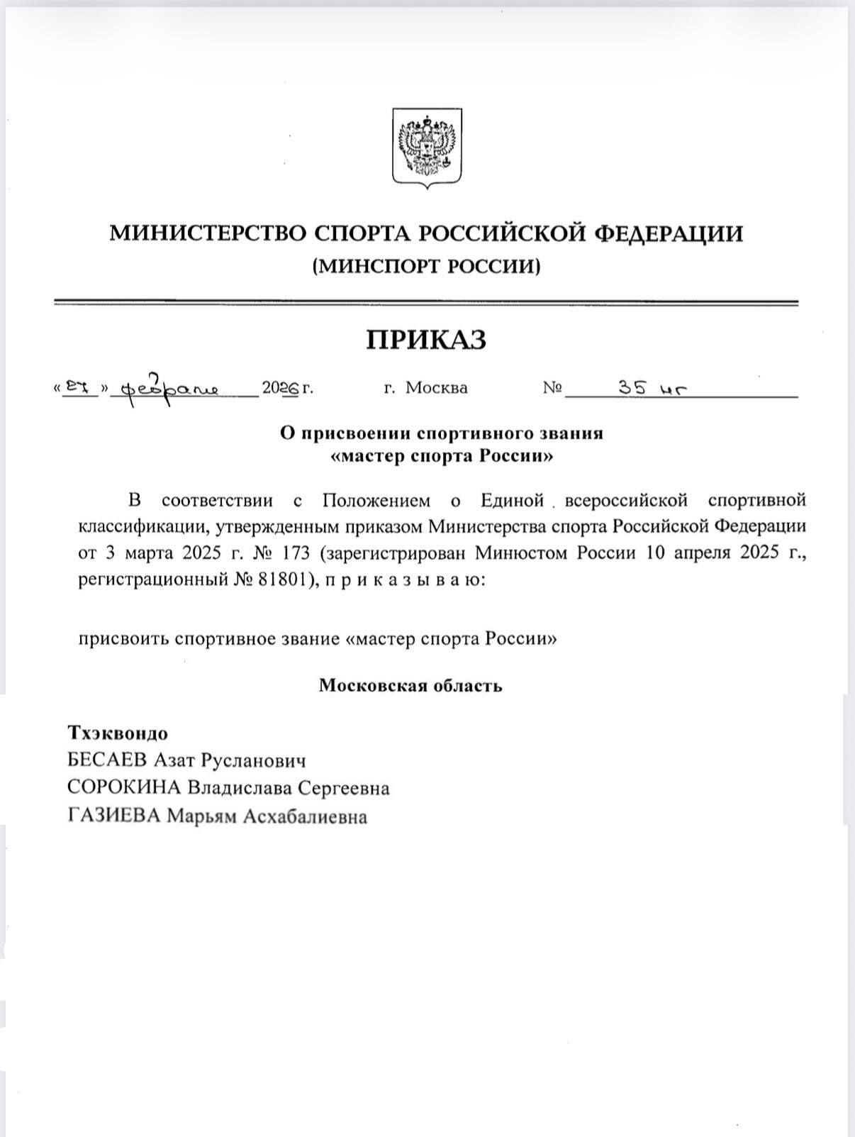 В соответствии с приказом Минспорта России от 27 февраля 2026 г. № 35 нг звание «Мастер спорта России» присвоено спортсменам Московской области: